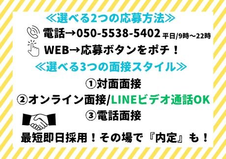 選考プロセス ◎もちろん、面接時の履歴書も不要です ◎応募いただいた方全員と面接します ■応募から内定までは最短1日! 【STEP1】応募 【STEP2】担当者より面接日時などをご連絡します 【STEP3】ご自宅から面接が可能です (LINE・WEB・電話での対応OK) ※平日夜間は19時まで面接受付中です 【STEP4】内定 【問合せ先について】 問合せ先:050-5538-5402 応募方法 選べる2つの応募方法 「電話」05055385402 ※平日9時~19時 「WEB」応募ボタンをポチ 選べる3つの面接方法 1)対面面接 2)オンライン面接(LINEのビデオ通話OK) 3)電話面接