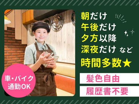 仕事内容 融通OK!自由シフト制☆夕方から勤務で学校やプライベートと両立◎ 「大学が終わってから18時~」 「サークル帰りで19時~」 など、希望シフトでOK! また、体調不良時などは、 当日でもシフト調整の対応が可能です! 「急に休んだら迷惑かける・・・」 なんて、心配はいりません◎ 助け合いがスムーズにできる 人間関係が良好なお店なので、 無理なく&ストレスなく働けます♪ また、週末は全時間帯でシフト相談OK! 「朝からランチまで」「ランチメインで」 など、短時間勤務はもちろん、 「授業がないからガッツリフルタイム!」も大歓迎!! 何でもお気軽にご相談ください☆ ディナータイムに働きたい方に!17時スタート募集☆ 『1週間ごとの希望シフト制』なので、 「大学・サークル」「プライベートタイム」 なども充実させることも可能です! 週2日~勤務が可能なので、 自分の働きやすいワークスタイルで働けるから、 みなさん長く続けています。 テスト期間や家庭の都合で「週0日」もOK◎ 学校生活やプライベートを 優先していただいて大丈夫ですよ! 仕事内容 *お客様のご案内 *オーダー *お料理の提供 *レジ など 以上のことをお願いします! マニュアルがあるほか、 メンバーもサポートするので 困った時は気軽に相談してくださいね。 まずはできることから 一つずつ始めていきましょう! 履歴書不要で始めやすい♪スピード選考も可能◎ 「家の近所だから」 「授業が終わってから働きたい」 「深夜時給でしっかり稼ぎたい」 など、志望理由はなんでもOK! 人柄重視の採用なので、 飲食店が未経験の方もご安心ください♪ ちょっといいかも…! と思ったらお気軽にご応募くださいね◎