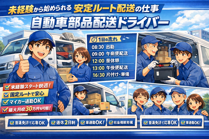 仕事内容 ハイエースまたは2t車で、自動車部品を配送するお仕事です。扱うのはドアやバンパー、オイルやバッテリーなど、整備工場や販売店に欠かせない商品です。 配送は1日2便、1便あたり約15件ほどの固定ルートが中心。道を覚えやすく、未経験の方でも安心してスタートできます。現在のスタッフも約8割が未経験から始めています。 ピッキングや積み込み、伝票処理、翌日の準備まで一連の業務を担当。お客様と顔なじみになることで、自然と信頼関係も築けます。 安定した仕事量があり、最大月収30万円も可能。長く安心して働きたい方にぴったりです。 具体的な仕事内容 ■部品のピッキング作業 ■積み込み・荷下ろし ■ルート配送(1日2便) ■伝票処理 ■翌日の準備 <1日の流れ(一例)> 《08:30〜 出勤・準備》 《09:00〜 午前便配送》 《12:00〜 休憩》 《13:00〜 午後便配送》 《16:30〜 片付け・準備》 <職場環境> 《20代〜50代が活躍中。落ち着いた雰囲気で、人間関係も良好です。》 <研修について> 《同乗研修あり。未経験でも安心して始められます。》