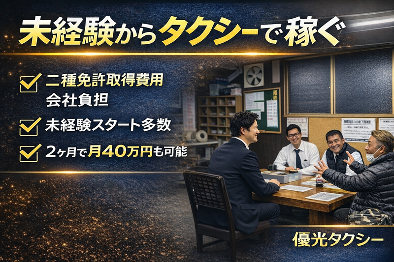 アピールポイント: ✅ 免許取得費用は「全額会社負担」!教習中も手当支給 普通免許(AT限定可)があればOK!二種免許の取得費用は会社がすべて出します。さらに、免許取得・研修中も**「手当15万円」**を支給。無収入の期間を作らずにスタートできます。 ✅ 未経験でも安心!「半年間30万円」の給与保証 「入社してすぐ稼げるか不安…」という心配は無用。最長半年間の給与保証があるから、じっくり運転と接客に慣れることができます。 ✅ 驚きの還元率60%!月収55万円以上も可能 頑張りがそのまま給与に直結する仕組みです。アプリ配車(GO・Uber)が売上の6割を占めるため、効率よく高収入を目指せる環境です。 ✅ 月18日休み!「1日働けば翌日は丸休み」 月の半分以上が休みになる「隔日勤務」。平日の空いた時間に趣味を楽しんだり、家族と夕食を囲んだりと、プライベートが充実します。 ✅ 最新車両の最上位グレードが75%!疲れ知らず 全68台のうち大半が最新の上位モデル。シートが良く、長距離・長時間の運転でも腰や肩への負担が少ないと、ベテラン層からも好評です。