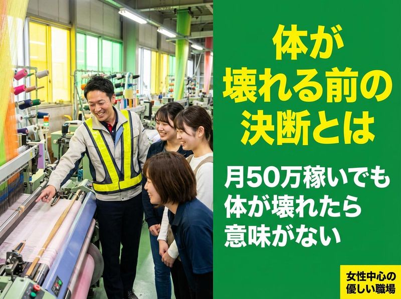 仕事内容 腰に湿布。膝にサポーター。 肩は上がらない。指は曲がらない。 朝4時半。 目覚ましより先に、体の痛みで目が覚める。 「あと何年、この体は持つだろう」 朝の鏡を見ながら、 そう思ったことはありませんか? 現場で長年働いてきたあなたへ、 体を壊す前に知ってほしい話があります。 その前に、あなたの体の悲鳴を 一緒にチェックさせてください。 【現場職人 体の悲鳴リスト10】 1. 腰 ぎっくり常習。湿布が手放せない。 ヘルニアで通院している。 2. 膝 軟骨が減ってきた。 階段の下りが辛い。 しゃがむと立てなくなる。 3. 肩 上に手が上がらない。 ローテーターカフ損傷の診断。 寝返りで痛みで目が覚める。 4. 首 頸椎ヘルニア。 手のしびれが取れない。 5. 肘・腕 テニス肘。 握力が落ちてきた。 6. 指・手首 ばね指。 腱鞘炎で曲げ伸ばしが痛い。 爪が割れる、剥がれる。 7. 足首 捻挫癖。 高い所から降りた瞬間にやる。 8. 皮膚 日焼けでシミだらけ。 粉塵・塗料・薬品で湿疹。 爪水虫。 9. 目 粉塵で慢性的に充血。 ドライアイ。 歳のせいか焦点が合わなくなった。 10. 心 朝起きるのが辛い。 休日は寝てるだけ。 家族と過ごす元気が残らない。 いくつ当てはまりましたか? もし、こんな職場があったら、 あなたはどう思いますか? ・8時始業(朝4時半起きから卒業) ・室内・座り作業も半分(体への負担激減) ・天候に関係なく月給制(雨で給料減らない) ・土日祝・お盆・年末年始すべて休み (年間休日124日) ・残業月平均2時間(原則定時退社) ・女性中心の優しい職場(怒鳴り合いゼロ) ・現場経験者の段取り力が即戦力 それが、根来繊維工業株式会社の 製造スケジュール調整・事務サポートの仕事です。 「現場経験者が活躍できる」3つの理由 理由1. 段取り力がそのまま武器になるから 現場で培った 「先を読む力」「人を動かす力」 「無駄を省く力」は、 製造スケジュール調整の仕事で そのまま活きます。 毎朝、女性パートスタッフ13名と 当日の作業内容・優先順位を共有し、 資材の動きを管理しながら現場を回す。 これは「現場の段取り」そのものです。 理由2. 体の負担が激減するから 仕事は現場作業と事務作業が半々。 1ケース10〜15kg程度のものを動かす 力作業はありますが、 高所・重量物・粉塵・薬品からは解放されます。 フォークリフトでの資材移動は、 体への負担を最小化します (未所持の方は会社負担で取得可能)。 理由3. 天候に左右されない安定収入だから 雨でも台風でも雪でも、月給は変わりません。 基本給20〜25万円+昇給+賞与(前年度実績あり)。 「雨だと今月の生活費が」という 職人特有の不安から完全に解放されます。 1日の仕事の流れ 8:00 出社、その日の製造予定確認 (朝4時半起きから3時間半遅くなります) 8:15-8:30 朝礼・作業指示 女性パートスタッフ13名に 当日の作業内容を共有 8:30-12:00 午前の現場フォロー 工程の進捗確認、資材の補充、 フォークリフトでの資材移動 12:00-13:00 昼休み (弁当持参でも近所のコンビニでも) 13:00-15:00 午後の事務作業 資材の発注、製造スケジュール作成、 Excelでの数量集計、 仕入先との電話・メール 15:00-16:30 午後の現場フォロー 出荷準備、製品の最終チェック、 フォークリフトでパレット積み込み 16:30-17:00 終礼・翌日準備 翌日の段取りを整えて退勤 17:00 退勤 (家族との時間が取れる毎日へ) 「現場の段取り力」が活きるBさんの話 ※当社の仮想モデルケースです 私は岸和田で12年、解体の現場で働いていました。 朝4時半起きで現場へ向かい、 夏は40度、冬は氷点下の中で働く毎日。 37歳の時、ぎっくり腰で1週間動けなくなり、 医者から「このままだと60歳まで持たない」 と言われました。 家族のために働いてきたのに、 家族と過ごす元気が残っていない。 そんな自分が嫌になっていました。 転職を考え始めましたが、 「現場以外の仕事は分からない」 「事務職なんて自分には無理」 と思い込んでいました。 そんな時、根来繊維工業の求人を見て、 「現場経験者の段取り力を活かす製造管理」 というフレーズが目に止まりました。 体験勤務に参加してみると、 今まで現場で当たり前にやっていた 「先読み」「段取り」「指示出し」が、 そのまま仕事になっていることに気づきました。 入社して2年。 腰の痛みも、膝の痛みも、 ほとんど無くなりました。 土日祝は息子のサッカーの試合に行けます。 妻が「最近、笑顔が増えたね」と言ってくれました。 体が壊れる前に、決断してよかった。 最後に 体の悲鳴は、無視し続けると 取り返しがつかなくなります。 40歳を越えてから現場を離れる職人を、 私たちは何人も見てきました。 その時には、もう体は元に戻りません。 「あと10年、現場でやれるか?」 そう自問して、答えに迷うなら。 体が壊れる前に、決断を変えてみませんか。 体験勤務は1〜2週間(給与支給)。 合わなければ、そこで辞退してください。 そこまでは、当社が責任を持ってお迎えします。