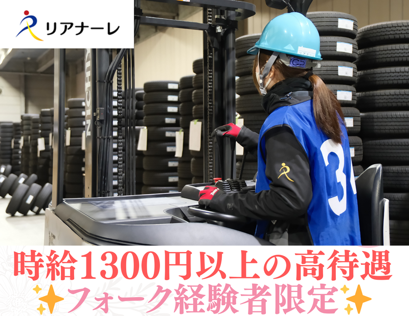 仕事内容 ✅フォークリフト作業が出来る方へ時給1300円の高待遇!✅ フォークリフト経験者を特別募集開始✨ タイヤの搬入・倉庫整理をお任せします。 規模拡大に伴う新案件の大増員募集となりますので フォークリフト資格をお持ちの方は 心機一転の良い機会としてぜひご応募ください✨ *資格をお持ちでない方の場合でも、 タイヤ交換作業スタッフとして 時給1250円で勤務する事が可能です! こちらの原稿からそのままご応募頂けます! <タイヤ倉庫内でのフォークリスト作業の流れ> (1)入庫作業 リーチフォークリフトを使用して、 タイヤの入庫業務を担当します。 倉庫内でのタイヤの移動、 積み込み、積み下ろし作業を行います (2)ピッキング業務 出荷準備の際はフォークリフトを使い、 高い位置にある棚からの荷下ろし後にピッキングを行います。 (3)在庫管理 在庫の整理・整頓、在庫数の確認、補充などを行います。 仲間と連携を取りながら効率的に在庫管理を実施しましょう。 ✅物流専門のプロフェッショナル「株式会社リアナーレ」について✨✅ 弊社は大手物流倉庫の管理を 数多くお任せ頂いている企業です。 リアナーレは大手企業様の請負をしている為、 他倉庫でのフォークリフト経験者も 数多く転職・挑戦して頂いています✅ 子育てと両立される方など活躍する層も様々です✨ 新しい仲間に多数出逢える事を期待していますので、 気になった方はぜひ積極的にご応募ください✨ ■リアナーレのHPはこちらから■ https://www.reanale.co.jp/