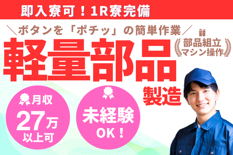 仕事内容 国内大手車メーカーの部品を作る工場! アルミでできた部品を作る作業をお願いします。 ■マシンオペレーター 機械に部品にしっかりセットして固定、 スイッチを押して完了! 完成後、部品を取り出して所定の位置に戻します。 曲げる、カットするなどの動きは機械が行うので お願いするのは部品セットと取り出しです。 ■検査 加工が終わった部品の品質チェック! サイズを測定したり、汚れなどが無いかを検査します。 ライン作業ではなく、担当のマシンや部品が決まっているお仕事! 部品の重さは、重たいもので5キロくらい。 簡単に持てるサイズの製品です! 工場未経験でもOK! 工場未経験の方も 積極的に受け入れている工場です。 研修もあるので安心してお仕事開始できます。 *家具家電付き!1R寮完備!* 〇寮の環境に関して 寮は八本松・西条・寺家駅周辺に用意! 住まいの周辺環境も良し! 大型ショッピングモール・ コンビニ・ファミレス等あり! 寮設備はエアコン、冷蔵庫、洗濯機、テレビ、テーブル、 寝具一式、電子レンジなど。 *お金周りの福利厚生充実!* もちろん福利厚生充実! 〇いつでもOK!日払い制度! 24時間365日支払い可能な日払い制度を導入! いつでも申請、受け取り可能です! 〇通勤交通費の支給あり! 稼ぐためにお仕事するので、 もちろん職場までの交通費支給あり! 車通勤、バイク通勤、自転車通勤もちろんOK! 〇制服無償貸与あり! 最初の制服代、意外と痛い出費ですよね? エヌエス・テックなら1枚目の作業着を会社負担! 働く前にかかる初期投資、とことん抑えます! <まずは面談して登録しませんか?> ■豊富な求人! 多くの工場と提携していて、さまざまな求人を扱っております。そのため登録しておくだけでも、自分に合ったお仕事の紹介が受けられます。 ■すぐ働く予定でなくてもOK! 先の転職に向けての「とりあえず登録だけしておこう」でもOKです! 登録する事で新着の求人をいち早く紹介してもらえたり、転職の時期に合わせた求人の提案を受けられるなどのメリットもあります。 ■幅広い職種からお仕事を選択可能! 「工場求人」といっても、 色々なお仕事があります。 半導体装置の組立、車の部品取り付け、物流工場での部品調達、部品の検査etc... 自分の経験や職歴、これからのキャリアを考えてのお仕事紹介が可能!