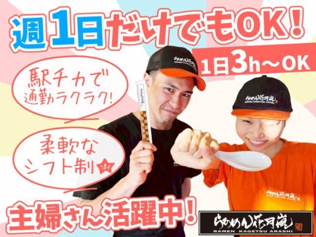 仕事情報 ● 仕事内容 ラーメン店にて、調理補助や簡単な盛り付け、片付け、 洗い物などキッチン業務をお任せします! まずは言われたことを丁寧に取り組んでいただければOK! ラーメンの調理ができるようしっかりお教えするので ご安心くださいね! 未経験でも安心! バイト自体初めての方でも、 全国に300店舗近くの店舗を展開してきた当社ならではの 手厚い教育プランでしっかりバックアップします! まずはあなたのできること・簡単なことから お任せしていきますので安心してくださいね。 らあめん花月嵐のこだわり 看板商品「嵐げんこつらあめん」を筆頭に、 有名シェフ・ラーメン店主やタレントとコラボした 期間限定メニュー等を提供する次世代型ラーメン店! 店内はどこか懐かしく、でも他とちょっと違う雰囲気。 ラーメンを更ににおいしく食べられる工夫を散りばめています。 シフトは自己申告制! 自分の予定優先でOK!短時間勤務も相談に応じます♪ 平日のランチのみのパートさんや夜だけ働く学生バイトさん 独立を目指すフリーターさんなど、 たくさんのスタッフが自分の都合に合わせて イキイキとバイトしています! メリット盛りだくさん! 幅広い世代のスタッフが活躍している当店。 月1回登場する新メニューもいち早く試食できます◎ ラーメン好きにはたまりません♪ 求人への応募が初めての方も大歓迎! 居心地の良さ抜群のお店で私たちと一緒にバイトしましょう!