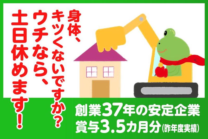 仕事内容 今の現場、5年後、10年後も同じように働けますか? 長年、解体・土木の業界で、技術を磨いてこられたあなたへ。 「会社の将来を考えると、家族のためにも、このままでは…」 「休みは少ないし、身体への負担も正直キツくなってきた…」 「俺の経験は、もっと給与や待遇で評価されるべきじゃないか?」 もし、そんな思いが少しでもあるのなら。 創業37年以上の安定企業である私たちが、 あなたの貴重な経験と技術に 「確かな安定」と「正当な評価」で応えます。 一度、話だけでも聞いてみませんか。 お電話でのお問い合わせや見学も受付中! 0776666868 (担当:中尾)まで お気軽にお問い合わせください。 ー 【具体的な仕事内容】 あなたの豊富な経験を活かし、 現場の核となる存在として チームを牽引してください。 古い建物をまっさらにして、 新しい街づくりへとつなぐ、 社会貢献性の高い仕事です。 これまで培ってきたあなたの技術で、 未来の街づくりを 支えていきませんか。 若手への技術指導など、 あなたの経験を次世代に繋ぐ役割も、 ぜひお任せしたいと考えています。 もちろん、いきなり丸投げはしません。 当社のやり方に慣れるまで、 会社全体でしっかりサポートします。 ー あなたの経験に【安定と評価】で応える3つの理由 1.【創業33年以上の安定基盤と休日】 業界では珍しい【完全週休2日制(土日休み)】 夏季・年末年始の長期休暇もしっかり取得可能。 創業から33年以上、地域に根差してきた安定企業だからこそ、 先の見通しが立てやすい環境で、安心して技術を発揮できます。 2.【その技術、給与と賞与で正当に評価】 月給25.5万円は、あくまで未経験者の最低保証額です。 あなたの経験・スキル・資格を最大限に評価し、給与を決定します。 さらに賞与は年3回・昨年実績3.5ヶ月分を支給。 あなたの頑張りが、目に見えるかたちで還元されます。 3.【身体と家族を大切にする働き方へ】 残業は月平均15時間と少なめ。 17時には現場作業を終え、毎日家に帰る生活が手に入ります。 年齢を重ねても無理なく働けるよう、 安全管理とチームワークを徹底。 家族と過ごす時間や、 自分の趣味の時間を大切にしながら、 腰を据えて働けます。