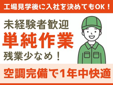 仕事内容 未経験OKのモクモク単純作業 1つひとつの作業はシンプルで覚えやすい内容ばかり! あなたの適性やペースに合わせて配属先を決定します。 「自分に向いてる仕事ってなんだろう…?」と不安な方も大丈夫◎ 無理なく続けられるお仕事がきっと見つかります!! 【仕事内容】 ・原材料の準備、機械に補充などの工程 ・部品の製造工程(簡単な機械操作メイン) ・完成品の検査工程(目視や機械使用) ※あなたに合った工程をお願いします! 製造業の経験ゼロでも先輩スタッフが、基礎から丁寧に教えます! 定着率バツグンで、長く働いている方多数活躍中! ☆★ポイント★☆ *<年間休日120日>土日休または週休2日制で私生活の充実可! *空調完備で1年中快適&綺麗な工場で働ける ★職場見学実施中★ 工場見学で仕事内容や職場の雰囲気を 見てから入社が可能です!