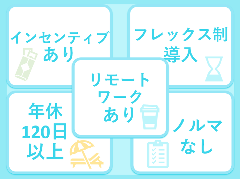 勤務時間詳細 総労働時間:1週あたり40時間 ■勤務時間 フレックスタイム制を採用しています。ご自身の予定に合わせた柔軟な働き方が可能です。 ■リモートワークについて お客さまとの面談は、お客さまのご都合に合わせてリモートでの実施も可能です。