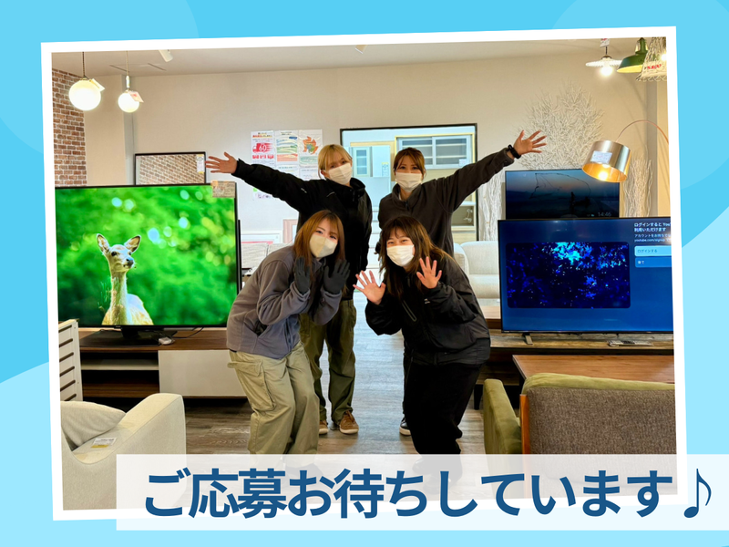 【保険制度】 雇用保険、労災保険、健康保険、厚生年金 待遇・福利厚生 【福利厚生】 ◆昇給 ◆交通費全額支給 ◆車・バイク・自転車通勤可 ◆無料駐車場完備 ◆自転車の無料貸出有 ◆制服貸与 ◆資格取得支援制度有 ◆社割有(家具・家電) ◆社員登用制度有<実績多数有!> ◆日払いOK(規定) ⇒働いた分のお給料をスグ貰えます!