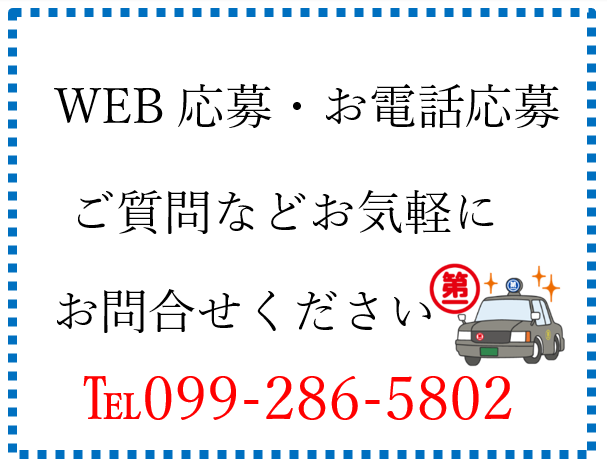 ■応募後の流れ 【応募について】 ここまでお読みいただきありがとうございます。 まずは「応募する」ボタンを押して応募画面へ。 氏名等を入力して簡単に応募できます。 WEBは365日、24時間受付中! 【選考フロー】 面接(1回)予定 ※会社説明会に参加を希望される方は事前にご連絡ください。 ※WEB面談会も実施中:詳しくは『第一交通 会社説明会』で検索! 【第一交通産業株式会社について】 創業:昭和35年創業 本社:福岡県北九州市 鹿児島第一交通は鹿児島県内の10拠点で営業しています。 当社は、全国34都道府県にてタクシー事業を中心に展開しています。グループ会社全体のタクシー保有台数(約8700台)は、日本一を誇ります。 利用者を目的地に送り届けるだけの単純運輸ではなく、時代のニーズに合わせて地域に根ざしたサービスを提供しています。 【こんな求人をお探しの方にもおすすめ】 ・ドライバー、介護タクシー運転手、 タクシー乗務員、 乗合タクシー運転手、 ハイヤー運転手、ルート配送、送迎、運転代行、ラウンダーなどの求人をお探しの方 ・飲食、工場、警備員、営業、清掃、接客販売などの求人をお探しの方にもおすすめ ・ハローワークでお仕事をお探しの方も歓迎 ■応募受付電話番号 099-286-5802 ■個人情報の取扱いについて ご提供いただいた個人情報は、採用選考及び結果等の通知・連絡の為に利用いたします。 それ以外の利用目的または法令等に基づく要請の範囲を超えた利用はいたしません。