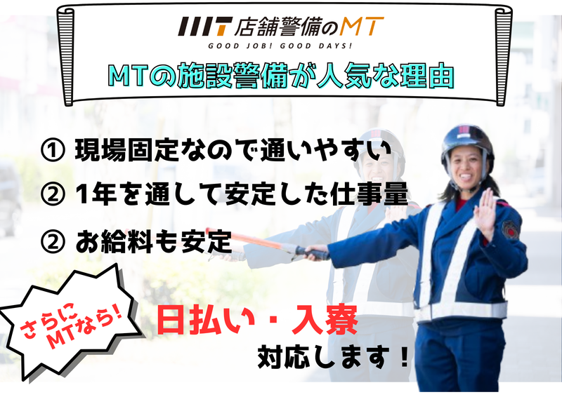 【日払いあり】寮あり!シフト制で安定収入★施設の警備スタッフ