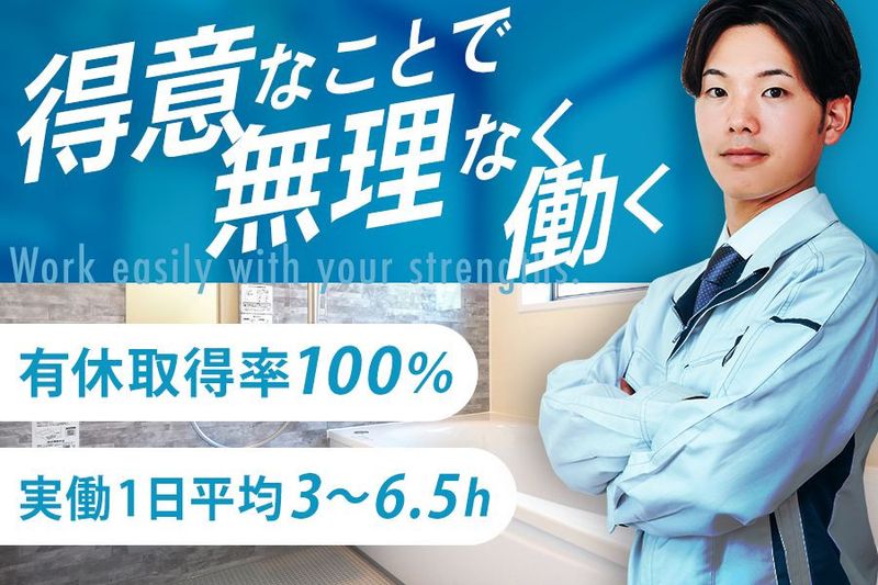 【アピールポイント】 \カジュアル面談&履歴書不要でカンタン選考/ 水回りリフォーム会社の設置スタッフを正社員募集! ▶土日祝休み ▶年間休日120日 ▶未経験OK/学歴不問 ▶実働平均3~6.5時間/早上がりでも日給保証 ▶月給40万目指せる! スキルにより月5~10万円さらに稼げる!◎