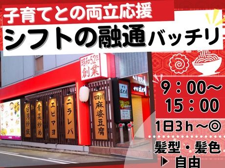 仕事内容 【30~40代ママさん活躍中】9時~15時内で扶養内OK! 「子どもを送り出してから、お迎えまでの時間を活かしたい」 「家事との両立ができる職場で働きたい」 「料理経験を活かして働きたい」 そんな30~40代の主婦(夫)さんにピッタリ! 金山駅徒歩2分の中華料理店で、 普段の料理経験が活かせるキッチンスタッフを募集中です。 ■普段のご飯を作る経験が活かせます! 中華料理店でのキッチンスタッフ ■食材の準備・仕込み ■簡単な調理補助(炒め物・揚げ物など) ■盛り付け ■皿洗い ■厨房内の清掃 普段のご飯作りと同じように、 「切る」「炒める」「盛り付ける」 これができればOK! 先輩スタッフが丁寧に教えるので、 飲食店未経験でも安心してスタートできます◎ <一日の流れ例:9:00~14:00勤務の場合> ───────────────────── 09:00 出勤・着替え 「おはようございます!」 09:30 食材の準備・仕込み 野菜を切ったり、下ごしらえ 家での料理と同じ感覚で◎ 11:00 ランチタイム調理開始 炒め物や盛り付けなど 先輩と協力しながら進めます 13:00 片付け・清掃 厨房内を綺麗に整えます 14:00 お疲れ様でした!退勤 子どものお迎えまでまだ余裕◎ スーパーに寄って帰れますし、 全メニュー50%OFFのまかないもあります♪ ■30~40代ママさんが選ぶ理由!? 【1】子どもの生活リズムに合わせて働ける◎ ━━━━━━━━━━━━━━━━━━━━━━ ★9:00~14:00 / 11:00~15:00など時間選べます ★平日のみOK!週2日~、1日3時間~OK ★シフトは前月末までに提出で予定が立てやすい ★扶養内勤務もOK <こんな働き方ができます> 例1)9:00~14:00 週4日勤務 →月収 約73,600円(扶養内でしっかり収入) 例2)11:00~14:00 週3日勤務 →月収 約41,400円(短時間で無理なく) 例3)9:00~13:00 週3日勤務 →月収 約55,200円(午後は自分の時間に) 14時には退勤できるから、 子どものお迎え・習い事の送迎・ 夕飯の買い物も余裕でできます! 【2】家庭最優先!急なお休みも相談しやすい♪ ━━━━━━━━━━━━━━━━━━━━━━ ★ 子どもの急な発熱・体調不良 ★ 学校行事・授業参観・PTA活動 ★ 家族の通院や用事 30~40代の先輩ママスタッフが多数在籍! お互いの事情を理解し合える環境だから、 「子どもが急に熱出して...」という時も 安心して相談できます◎ 【3】金山駅から徒歩2分!通いやすさ抜群! ━━━━━━━━━━━━━━━━━━━━━━ ★金山駅から徒歩2分の好立地 ★雨の日も傘を差す時間は最小限 ★交通費規定支給あり 短時間勤務でも通勤が楽だから、 「ちょっと行ってくるね」の感覚で通えます! 【4】普段の料理経験がそのまま活かせる◎ ━━━━━━━━━━━━━━━━━━━━━━ 家で毎日作っている料理の延長線上! 「包丁が使える」「炒め物ができる」 それだけで十分スタートできます。 ★調理経験のない方も大歓迎 ★先輩スタッフが丁寧にサポート ★マニュアルもあるので安心 「中華料理なんて作ったことない...」 という方でも大丈夫! 普段の料理と基本は同じです◎ 【5】嬉しい待遇・働きやすい環境 ━━━━━━━━━━━━━━━━━━━━━━ ★全メニュー50%OFFの食事補助 →「お昼ご飯作らなくていいから助かる!」 ★髪型・髪色自由 ★制服貸与で通勤服に悩まない ★交通費規定支給 「バイト中にお昼食べられるから、 家で昼ごはん作らなくていい」 これが地味に助かると大好評です! ■先輩ママスタッフの声 【Aさん・40代主婦(夫)】 「子どもが学校に行っている間だけ働けるので助かります。 14時に上がれるから、子どもが帰ってくる前に 家に帰れるのが嬉しいですね」 【Bさん・30代主婦(夫)】 「急な子どもの発熱でも休みやすい環境です。 みんな子育て経験者だから、お互い様の気持ちで フォローし合えるのがありがたいです」 【Cさん・40代主婦(夫)】 「まかないで昼ごはんが食べられるから、 家で昼ごはん作らなくていいのが本当に楽! 食費も浮くし一石二鳥です(笑)」 【Dさん・30代主婦(夫)】 「飲食店で働くのは初めてでしたが、 普段の料理の延長線上だから意外とすぐ慣れました。 シフトの融通も効くし、長く続けられそうです」