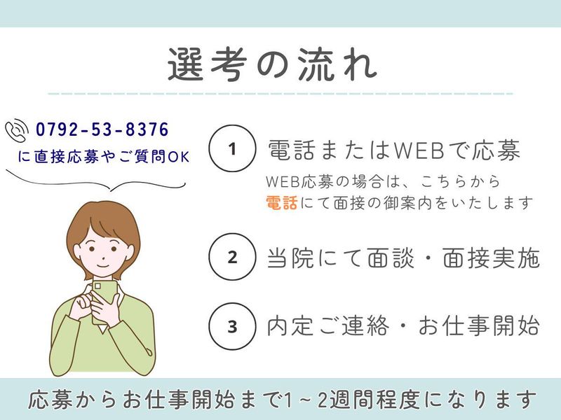 選考プロセス 【応募の流れ】 1)「応募画面へ進む」より必要事項を入力の上送信してください。 ※応募後すぐに「応募完了メール」が送付されますが 届かない場合は、直接お電話お願いします。 ★電話応募も大歓迎です(0792-53-8376) 2)面接日設定 ※電話にて日程調整のご連絡いたします 3)面接(履歴書をご持参ください ) 4)内定、勤務スタート日相談 応募頂いた方から、順次選考を進めます。 採用人数集まり次第、早めに掲載終了することもありますので早めのご応募をお願いします