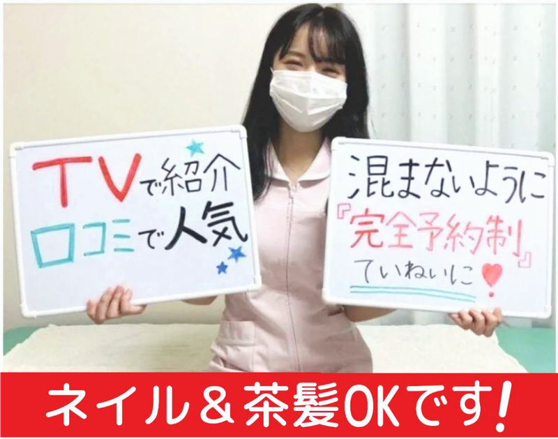 仕事内容 \\アピールポイント// ✅週1日~OK!学生に人気のラクチン簡単な受付バイト! ✅完全予約制。ゆったり接客♪ ✅人生初バイトも安心。分かりやすく研修いたします! ✅学校の課題・スマホ持ち込みOK!見放題◎ ✅ピアス・ネイルOK! お客様は少人数で完全予約制ですので スピードよりも丁寧に笑顔で接客して頂ける方におススメ! ◆美容整体ですので、お客様は女性専用です。 【仕事内容】 やまもと整骨院にて 受付・ご案内などの業務を お任せします。 完全予約制のため、 忙しくバタバタすることは少なく ゆったり落ち着いて働けます。 受付のお仕事が未経験の方でも 丁寧に研修しますので 安心してスタートできますよ♪ 【具体的には・・・】 ・簡単なオープン準備。 ・来院された方を受付して御案内。 ・料金表を通りにお会計。 ・後片付けなど ■完全予約制のゆったり受付  ̄ ̄ ̄ ̄ ̄ ̄ ̄ ̄ ̄ ̄ ̄ ̄ ̄ ̄ ̄ ̄ ̄ ̄ ̄ やまもと整骨院は完全予約制の整骨院です♪ 忙しくテキパキ動く スピード重視の接客ではなく、 お一人お一人に優しく丁寧に 対応して頂けたらOKです! 「接客は好きだけど シンドイ立ち仕事よりも、座ってメインがイイ」 という方にもピッタリ。 ■人生初バイトでも安心  ̄ ̄ ̄ ̄ ̄ ̄ ̄ ̄ ̄ ̄ ̄ ̄ ̄ ̄ ̄ ̄ ̄ ̄ ̄ 現在働いているスタッフも受付のお仕事は 全員が未経験スタートです◎ そのため、初バイトの方でも 安心して始められるよう 丁寧に研修を行います。 中学生の職業体験でも出来たくらいに仕事内容はラクチン・カンタン◎ 先輩スタッフも優しくサポートしますので、 分からないことはドンドン聞いて下さい。。 人生初バイトの方も安心してご応募ください。 ■学生に人気の勤務時間  ̄ ̄ ̄ ̄ ̄ ̄ ̄ ̄ ̄ ̄ ̄ ̄ ̄ ̄ ̄ ̄ ̄ ̄ ̄ 平日は18:00または18:30~、土日は午前のみ。 週1日から勤務できるため 授業やサークルとの両立も無理なく可能です。 また院内では学校の課題や宿題、 スマホの持ち込みもOK。 空いた時間を有効に使うことができます。 ピアスやネイルもOKで 髪色も明るすぎなければ 茶髪でも問題ナシです◎ 学生さんがノンビリと働きやすいラクチンな受付バイトです!