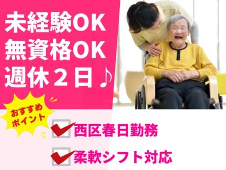 仕事内容 \ここがポイント/ ★ 熊本県熊本市西区春日での介護職募集! ★ 無資格・未経験OK!サポート体制充実で安心◎ ★ 介護資格や普通自動車免許があれば尚可♪ ★ 週休2日制のシフト勤務で働きやすい! *・。・。*・。・。*・。・。* <仕事内容> ご利用者様の日常生活をサポートする介護業務です。 資格や経験がなくても、研修やサポート体制がしっかりしているため安心して働けます。 - 食事、入浴、排泄などの身体介助 - 日常生活のサポートや見守り - ご家族との連絡や相談対応 *・。・。*・。・。*・。・。*