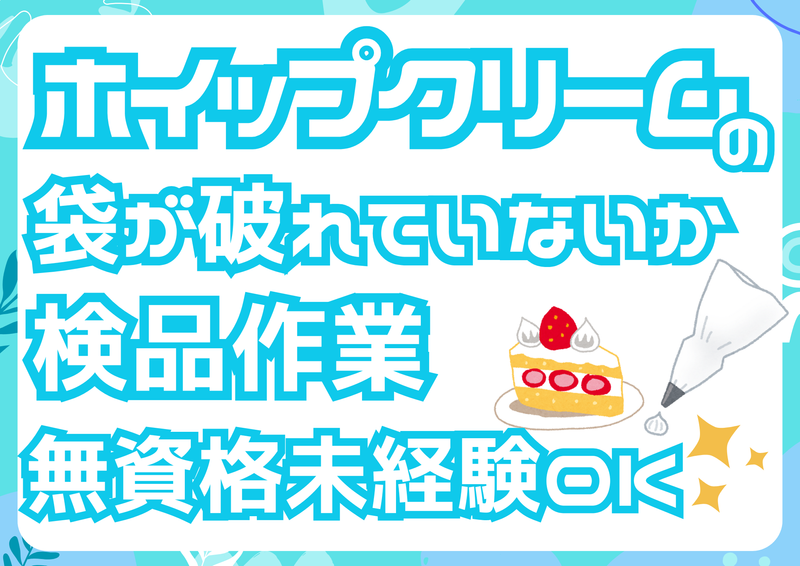仕事内容 <パートタイム>洋菓子用ホイップクリーム出荷準備の為のライン作業 容器や箱の補充、袋が破れていないか・キズがないか・プリントが間違えていないか等をチェックする検品、箱に商品を詰める出荷準備