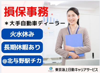 仕事の内容 \損保ご経験者の募集!/ ◆完全週休二日制!火水休み ◆弊社ベテランスタッフさんご活躍中!気軽に質問・確認◎ ◆GWや夏季は長めの休暇でリフレッシュ♪ @北与野駅チカ&さいたま新都心駅から徒歩圏内 【基本情報】 雇用形態:派遣社員 雇用期間:長期(3カ月以上) └3月~開始日相談可能 就業時間:9:30~18:30(休憩60分) 【必須条件】 ◆損保事務のご経験ある方 ◆パソコン:基本操作(入力~修正) 【お仕事内容】 ◆種目:自動車のみ ◆扱い:東京海上日動、あいおい、三井住友 ・試算~見積書作成 ・申込書チェック ・端末入力~計上 ・自賠責の精算 ・満期管理 ・資料作成 など 【こんな方にオススメ】 ・保険のキャリアをスタートしたい ・ある程度流れの決まった業務が好き ・フルタイムでも家庭とムリなく両立したい 【環境面等】 @北与野駅チカ・さいたま新都心駅からも徒歩圏内 ・大手自動車ディーラー内でのご勤務 ・20代・30代・40代・50代活躍中の職場 └わからないことは先輩に質問、確認をしながらオシゴトできる環境です └お弁当持参OKです ・オフィスカジュアル内で服装自由 ・社会保険完備 ・禁煙オフィス!煙苦手な方も安心 ・平日休み/年間休日120日以上 └お休み調整可:事前に申請いただければお休みも可能です ○●ご応募検討中の方へ● ・安定した環境で、無理なくお仕事したい方にぴったりの職場です!ご応募お待ちしています! ○●嬉しいPOINTたくさん!●○ 履歴書不要!開始日相談OK/北与野駅チカ/駅歩5分以内/ブランクOK/資格取得支援/月収例23万円以上/社会保険完備/残業なし/18時半退社/8時間以内勤務