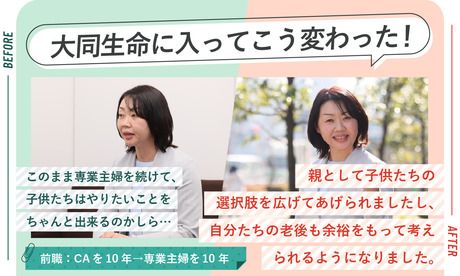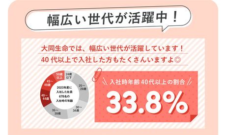 職場環境 【従業員構成】 当社社員の入社時の平均年齢は【34.5歳】(2023年度) 自分自身の新しい人生を歩みたい方を大同生命は応援します! 「家庭に専念していたが復職したい」 「子育てと両立し働きたい」 などの理由で入社される主婦・子育てママさんが多数います。 【この仕事を通して身に付くこと】 「働きやすさ」「長く勤めている女性の多さ」「年齢不問」という点に魅かれて入社した人が多数! 未経験でも活躍できている理由は、研修制度にあります。 ビジネスマナーや税務、マネジメントなど、年次・役職に応じて種類豊富にご用意。さらに、PCで視聴できるなど、個々人の必要に応じて学べる環境を整えています。 また、資格取得も推奨。「ファイナンシャル・プランニング技能士」3級はプランナーの6割が取得済です。