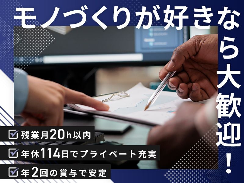 仕事内容 ・-・-・-・-・-・-・-・-・ 探求心が、形になる場所! 理想の機械を創り出す、設計のプロへ ベテランの技を学べる場所が、 ここにあります! ・-・-・-・-・-・-・-・-・ \働くうえでのポイントは?/ ✅賞与年2回+昇給制度あり! ✅各種セミナー+研修会あり! ✅創業30年以上の企業 ✅年間休日114日+残業少なめ ================ 【仕事内容】 お客様からのご要望・仕様書に合わせて、 機械設備の設計をお任せします。 ・仕様の打ち合わせ ・機械構想図の作成 ・詳細設計 ・お客様との調整 ・部品図の作成 【使用機器】 ・2D CAD マイクロキャダム ・3D CAD ソリッドワークス ================