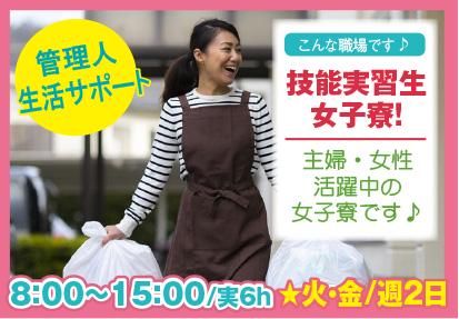 求めている人材 ◎未経験の方も大歓迎! 親切丁寧に指導するので安心♪ ◆経験等不問の人柄採用! ・扶養控除内OK♪ ・子育て経験等活かせます。 (異国で頑張る実習生の生活サポート中心) ・日常清掃等の経験ある方 ・接客やサービス業の経験ある方尚歓迎♪ ・マンション、ビル等の管理人経験ある方 ◆30代・40代・50代・60代前半! 幅広い年代の主婦・女性活躍中♪ <こんな方にもオススメ!> ・週2日程度で働きたい方 ・子育てが一段落された方 ・家庭とお仕事両立して働きたい ・人に喜ばれるお仕事がしたい ・心配りのできる方 ・近隣にお住まいの方、など