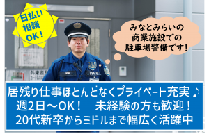インフォメーション 週2日~4日/平日のみ/土日のみ全部OK!未経験からアルバイト・パートで働きませんか? ☆一緒に働くメンバー募集中☆ ◇◇◇◇◇◇◇◇◇◇◇◇◇◇◇◇◇◇◇◇◇◇◇◇◇◇◇◇◇◇◇◇◇◇◇◇◇◇◇◇◇◇ ☆横浜市西区の商業施設 での警備スタッフ募集☆ 20代・30代の若手から40代・50代のミドルまで活躍中! ◇◇◇◇◇◇◇◇◇◇◇◇◇◇◇◇◇◇◇◇◇◇◇◇◇◇◇◇◇◇◇◇◇◇◇◇◇◇◇◇◇◇ ☆ご質問・ご応募はこちらまでお願いします! 東洋ワークセキュリティ株式会社 横浜営業所 TEL:045-317-5033 もちろんWeb応募も歓迎です! ☆☆☆☆☆☆☆☆☆☆☆☆☆☆☆☆☆☆☆☆☆☆☆☆☆☆☆☆☆☆☆☆☆☆☆☆☆☆☆☆☆☆ 私たち東洋ワークセキュリティは、 全国に47拠点を展開し、 幅広いネットワークと培ってきたノウハウで、 皆様に「安全と安心」を提供しています。 警備のお仕事は「固そう・難しそう」といったようなイメージを持たれがちです。 しかし、実際は難しい動作や誘導はありませんし、重いものをもつ作業もありません! 簡単に覚えていただけるお仕事がほとんどで、 体に大きな負担がかかることもありません! そのため、社員の年齢層は幅広く、性別や経験も問わず活躍できます! 地域の安全と安心を守るために皆さんのお力をお貸しください! アピールポイント ☆★☆東洋ワークセキュリティの待遇☆★☆ 〇各種保険完備(法定通り加入) 社会保険にはすぐに加入していただけます。 扶養家族の方も加入していただけます。 ご相談ください! 〇時間通りに退勤! シフト制のため終業時刻を超えるような お仕事はほとんどありません。 また、お仕事の持ち帰りや緊急対応も ほとんどないため、 退勤後はゆっくりプライベートの時間を 過ごせます。 〇充実の研修制度で未経験でも安心 多くの人が警備経験なしの状態で スタートしています! 業務に就く前にしっかりと研修を受けられる ため不安をなくして働けます。 〇直行直帰可能 ご自宅と会社が遠い方もご安心ください。 就業場所までは直接向かっていただけます! もちろんたまに会社に顔を出していただく のも大歓迎です♪ 〇入社後の資格取得を応援! 警備のお仕事には資格もいっぱいあります! もちろん資格取得費用は全額会社負担、 合格のための講習会も開催します。 合格した方には資格手当を お支払いいたします! 〇充実の福利厚生 福利厚生倶楽部に加入できるので飲食店や 映画館などで様々な優待を受けられます。 年2回のミニボーナスや 備品・空調ウェア・防寒着・制服無償貸与も嬉しい特典♪ 〇この求人は東京エリア採用強化求人です! 当社では東京・神奈川・千葉エリアでの 募集を強化しております! ☆★☆東洋ワークグループについて☆★☆ 東洋ワークセキュリティは1976年に創業した従業員8,500名を超える東洋ワークグループ(TWG)の一員です。 TWGは、「Work(仕事)」を開発することで、多様な「人財」が活躍し「Work」に関わるすべての人々のやりがいと、物心両面の幸福「Well-being」を追求しているグループです。東北からグローバルに事業を展開する企業として、未来が求める多様な働き方やライフスタイルを推進し、また既存の事業にとらわれない“革新的”な“Business Developer”として働く人と共に成長し幸福を実現します。 【事業領域】 ■HRセグメント 東北地方における人材ビジネス業界のパイオニアとして、派遣、請負、人材紹介、国際事業などを通じて、人と組織にかかわる多様なサービスを提供しています。インドネシア法人によるアジア圏の人材採用も展開しています。 ■SEC(Security)セグメント 東北最大級のマンパワーを強みとし、警備を主体とする総合セキュリティ事業、建物サービス事業、防犯・安全管理システム販売事業、保安用資器材レンタル事業の4分野を軸に展開しています。 ■SBE(Social Business Enterprise)セグメント SBEとは、障がい者や長期失業者など、 特に雇用を得にくい人たちを優先的に雇う企業の意味です。東洋ワーク株式会社の洗浄事業として始まり、2010年に東洋ワークグループの特例子会社として事業独立。洗浄事業を通して、障がい者に安心して働ける機会を提供し、自立を支援しています。 ■Abroad(海外展開) 人材確保から海外進出支援まで、アジア圏でのビジネスをプロデュースしています。法人設立以来、アジア圏で人材開発や市場参入支援に取り組んできました。時代に先駆けてアジアに目を向けたのは、日本の少子高齢化による労働人口の減少を見据え、国内の人材不足や市場縮小を解決する手立てを海外に見出したフロンティア精神から。中でもインドネシアでは、日系企業160社以上とコンサルティング契約を結ぶなど、アジア圏でのビジネスをサポートしております。 自分力バロメータ コミュニケーション力 協調性 理解力