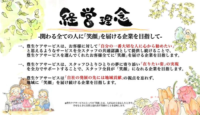 アピールポイント: 豊生ケアサービスの経営理念は、 関わるすべての人に笑顔(安心や幸せ)を届けることです。 サービス提供責任者は、 ご利用者様やご家族の不安を安心に変え、 その先にある「笑顔」に触れられる仕事です。 私たちは、利用者様だけでなく、 働くスタッフも笑顔になれる「ええ会社」づくりを大切にしています。 現場の声に耳を傾け、より良い職場を目指して改善を続ける、 現在進行形で成長している会社です。 「誰かの安心のために力を尽くしたい」 「自分自身も大切にしながら働きたい」 そんな想いを持つ方をお待ちしています。 【豊生ケアサービスで働くサ責の安心ポイント】 ☑ 平均残業時間1.2時間 一般的な介護業界の平均値は10時間程度となってます。 ☑ 誕生日休暇・夏季休暇あり 仕事だけではなく、スタッフ自身の時間も大切にしています。 ☑ 有給取得率70%以上 計画的かつ積極的に有給を取得できる雰囲気になっています。 ☑ミモザ認証、SDGs認証、健康経営有料法人認証等、各種認証取得 働きやすさ、人への配慮が第三者機関から認められた職場です。 ☑ 人間関係の良さが自慢です 外部アンケートでも高評価。相談しやすく、フォローしあえる風土があります。