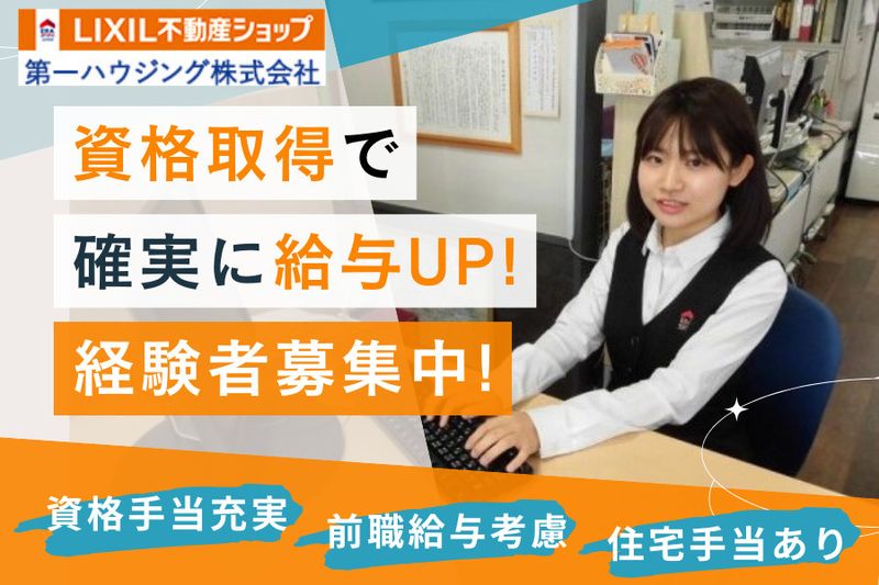 【仕事内容】 \資格取得重視の評価制度で確実に給与UP!/ LIXIL不動産ショップで不動産事務を正社員募集! 《応募条件》 不動産事務の実務経験3年以上の方 ✅宅建をお持ちの方は月給28万円以上スタート 《仕事内容》 不動産事務として下記業務をお願いします ・書類作成(契約書など) ・契約期日管理/更新手続き ・家賃の入金管理/送金業務 ・募集図面の作成(Visioを使用) |経験者の方にも丁寧な研修を実施 先輩社員のメンターがつくので、 ブランクがある方や転職後の不安がある方も安心です♪ わからない事も聞きやすいような環境です LIXILグループの研修もあり、必要な知識がしっかり身につきます ────────────── 《おすすめポイント》 ────────────── ◆資格を取った分、給与がUP! 当社はお客様に納得感のある提案をするため、資格を重視しています! 指定の資格取得で翌月より資格手当支給 コツコツと着実に給与を上げたい方にはピッタリです ※給与に反映される資格は福利厚生欄をご覧ください ────────────── ◆プライベートを大切にできる環境 3連休を年に複数回導入中! 長期休暇(夏季/年末年始/GW)や誕生日休暇もある職場です♪ 育児で急なお休みを取らなければならない時でも対応可能 ────────────── ◆福利厚生も充実! 嬉しい住宅手当あり(15,000円/月) 病気入院治療費用負担制度あり(AIG企業保険) ────────────── 《第一ハウジングについて》 創業1983年の「川崎・新川崎・鹿島田」エリアに特化している不動産会社です 不動産に関するあらゆる“お困りごと”に向き合い、地域の相談所として貢献しています プロのスタッフによるワンストップサービス体制を整え、 街の総合情報ステーション「街角情報館」として営業しています 《職場環境》 主婦(夫)を含む女性スタッフが多く活躍しており、 気軽に相談しやすい雰囲気です♪ 産前産後・育児休暇は女性2名の取得実績があり、 復職後もポジション変更なく活躍しています! 不動産事務として一緒に「第一ハウジング」で働きませんか? 弊社の不動産事務に少しでもご興味がある方、お気軽にお問い合わせください♪
