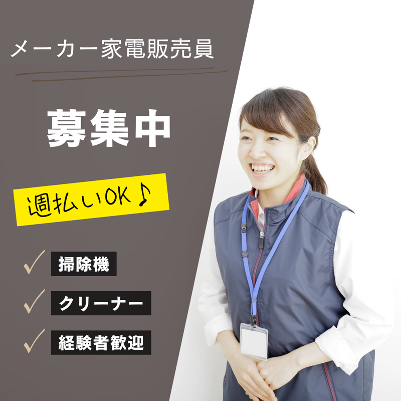仕事内容 *有名家電メーカーの販売員!!* 「接客・販売の経験を活かして、 お客様の生活をより豊かにする クリーナーを提案したい!」 「接客・販売のスキルをさらに高めたい!」 【おススメポイント】 ✅Wワーク可 ✅転勤なし ✅ノルマなし ✅残業ほぼなし ✅学歴不問 ✅週払い対応あり(規定あり) 大手家電量販店で お客様のクリーナー選びの お手伝いをお願いします。 クリーナーの用途は お客様も理解があるので、 おススメポイントや 特徴等を理解出来ればOKです。 サイズやその他の詳細は 慣れるまではパンフレットを見ながら 説明することも出来ます。 家電メーカーの担当者も バックアップしてくれますので、 わからないことがあればご相談可能です。 <接客販売の流れ> ご来店されたお客様に 積極的にお声掛けをお願いします。 お探しの物をお聞きして、 クリーナーであれば特徴等をお伝えして 販売業務を行ってください。 別の製品であれば、 担当スタッフに引継ぎをお願いします。 接客業務のない空いた時間は 展示商品のチェックや 他社製品の知識拡充をお願いします。 ◎契約時間に合わせて終業となります。 長時間の残業が発生することはほぼなく、 サービス業の中でも 残業が少ないお仕事になります。 接客が好き、販売が好き、 コミュニケーション能力を活かしたい、 何より家電製品が好きな方… ご応募お待ちしています!! 【アイ・フロント/アピールポイント】 ・来社不要のWEB面談対応 ・履歴書不要 (面談時にお聞かせください) ・土、日、祝日も電話対応可 ・派遣スタッフさんの就業店舗を 定期的に巡回。 お仕事についてのお悩み事や お困り事があればご相談ください。 ・契約延長前提のお仕事をご紹介 契約期間が3年を超えた場合の 無期契約対応もさせていただきます。 ・定年制なし。 アイ・フロントメンバーが ご就業後の皆様をしっかりサポートします。