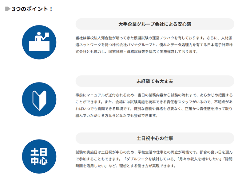 勤務時間詳細 ━━━━━━━━━━━━━ ◆ご都合が良い日程・会場に応募可能できます!試験の募集はシーズンにより差はありますが平均で宮城県は1~2回程度、その他の県は1回程度です。 ・試験日は【土日】がメインです。2026年は7/5(日)・12/6(日)に全県で大規模試験があります。 ・勤務時間、試験会場は試験により異なります。 ・登録制のため、ご応募のタイミングによりご紹介可能な案件が異なります ※会場・試験ごとに定員があります。応募しても必ず採用をお約束するものではありません。 ━━━━━━━━━━━━━