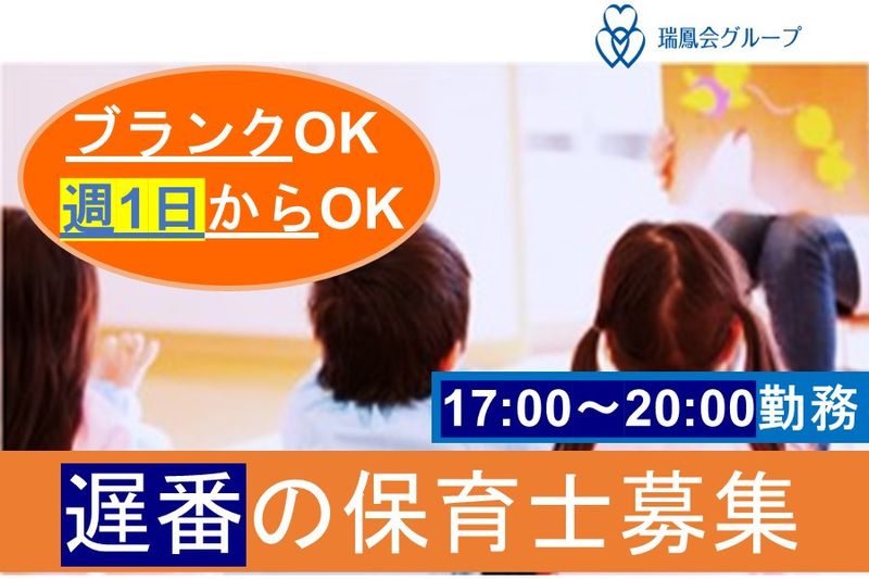 【アピールポイント】 認定こども園での遅番勤務の保育士募集! ✅週1日からOK✅ブランクOK✅60代〜70代の方が活躍中! ✅サポートメインのお仕事です✅ピアノが苦手な方でも安心です!