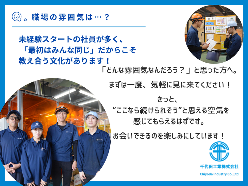仕事内容 「接客業から、土日休みの仕事に転職したい」 「そろそろ安定した会社で、しっかりボーナスをもらいたい」 そんな20代の若手スタッフが多数活躍中! 未経験から大手グループの安定感を手に入れませんか? \当社の推しポイント!/ ⭐ 未経験活躍中! ⭐ 年間休日121日 ⭐ 土日休み(トヨタカレンダー) ⭐ 大型連休年3回あり(各平均9連休) ⭐ 賞与はなんと5ヶ月分! ⭐ 夜勤手当で効率よく稼げる! (手当だけで月約3万円UP✨) ⭐ 残業代は全額支給◎ ⭐ 安心の教育体制 ■ どんな仕事…? ┈┈┈┈┈┈┈┈┈•• 車に使われる部品を作っていく業務です! 大きさは、最大でも両手で持てる程度! ▼ カンタン4ステップ!  ̄ ̄ ̄ ̄ ̄ ̄ ̄ ̄ ̄ ̄ ̄ ̄ ① 手のひらサイズの部品を型にカチッとはめる ※いくつかパーツを組み合わせることもあります。 ② 機械にセットして、 ボタンを「ポチッ」と押す(組み立ては機械にお任せ!) ③ 作る部品に応じて、①と②を繰り返す ④ 完成した部品を手に取って、 動きに問題がないか確認✨ ※軍手を着用し、直接手で触って確かめます! ▼ 安心ポイント  ̄ ̄ ̄ ̄ ̄ ̄ ̄ ̄ ベルトコンベアで次々と部品が流れてくる 「ライン作業」ではありません! 一人ひとりの持ち場で作業を進めるので、 「自分が遅れたら後ろの人に迷惑が…」という心配は無用です。 ■ 未経験でも大丈夫…? ┈┈┈┈┈┈┈┈┈┈┈┈•• 「工場で働くのは初めて…」 「機械の操作なんてできるかな…」 そんな方もご安心ください! 手厚いサポート体制でお迎えします✨ ▼ 入社後のステップ  ̄ ̄ ̄ ̄ ̄ ̄ ̄ ̄ ̄ ̄ 【 現場でのマンツーマン指導!】 まずは先輩スタッフが隣について、 イチから丁寧にお教えします。 「見て覚えろ!」なんてことは 絶対にないので安心してくださいね◎ 【 定期的な面談でしっかりケア!】 入社後、1ヶ月・3ヶ月・6ヶ月・1年…と人事担当との面談があります。 「立ち仕事にまだ慣れなくて…」 「夜勤のコツってありますか?」 など、仕事の悩みからちょっとした相談まで、 スグに話せる環境を整えています! ▼ ゆくゆくは…?  ̄ ̄ ̄ ̄ ̄ ̄ ̄ ̄ ̄ 経験を積んで仕事に慣れてきたら、 将来はリーダー職や管理業務へのステップアップも可能! 活躍の場が広がることで、 もちろん ” 給与UP ” にも直結します✨ 半期に一度の評価制度があるため、 「コツコツ頑張っているのに評価されない…」なんてことはありません! あなたの頑張りは、賞与や昇給でしっかり還元します◎ ■ 千代田工業ってどんな会社…? ┈┈┈┈┈┈┈┈┈┈┈┈┈┈┈•• ズバリ!「 大手と取引多数の、超・安定企業 」です✨ 創業から70年以上。 自動車部品づくりにおいて、 物流から生産、最後の品質管理までを自社で一貫して行っています! ▼ 驚異の ”不備率ほぼ0%”!  ̄ ̄ ̄ ̄ ̄ ̄ ̄ ̄ ̄ ̄ ̄ ̄ ̄ ̄ すべての工程に責任を持つことで、 製品の不備率はなんと” ほぼ0% ”を誇っています✨ この確かな品質が、当社の最大の強みです! ▼ だから、業績の安定感はバツグン◎  ̄ ̄ ̄ ̄ ̄ ̄ ̄ ̄ ̄ ̄ ̄ ̄ ̄ ̄ ̄ ̄ ̄ ̄ 高い技術力が評価され、「トヨタグループ」をはじめとする 大手自動車メーカー様からたくさんの信頼を獲得! おかげさまで、業績は常に安定しています。 ▼ 安定しているから、社員へ還元!  ̄ ̄ ̄ ̄ ̄ ̄ ̄ ̄ ̄ ̄ ̄ ̄ ̄ ̄ ̄ ̄ ̄ 会社がしっかり利益を出しているからこそ、 「賞与5ヶ月分」や「土日休み・大型連休」など、 社員のみなさんが安心して働ける 充実の待遇をご用意できています✨