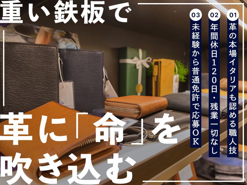 アピールポイント 【本場も認める技術力】 革の特性やお客様のご要望によって、 機械の動かし方は異なります。 視察に来られたイタリアのタンナー (生皮加工業者)やプレス企業から 技術力をお褒めいただいたことも! 【活躍中のスタッフ】 ●20代・30代活躍中 ●子育てママ・パパ在籍中 ●主婦・主夫活躍中 ●未経験者雇用実績あり