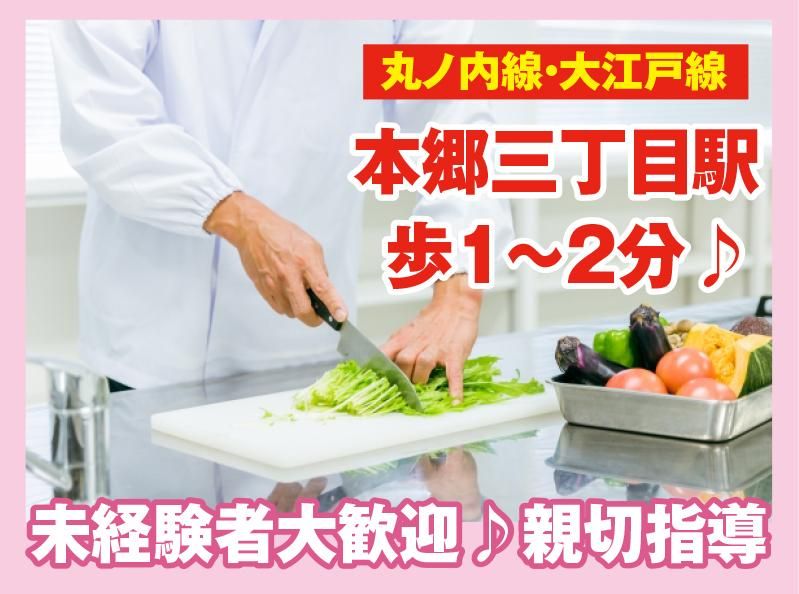 仕事内容 \働く方に楽しい食事を/ 安心の大手企業内/社員専用食堂♪ 【勤務地】好アクセス♪ 丸ノ内線・大江戸線 「本郷三丁目駅」歩1~2分♪ (文京区本郷3丁目) ♥調理補助スタッフさん 未経験大歓迎♪親切指導で安心♪ 20~63歳!主婦・女性活躍中! 【具体的には】 ・昼食等の調理補助 (日替り定食1種類) ・盛付け、提供 ・簡単な食器類の洗浄など 【勤務時間・曜日】 10:30~14:30/4h ★月~金曜/週5日(祝休) ◆ゆとりの勤務も大人気! 【休日・休暇】 土・日・祝日・GW・年末年始 他、企業カレンダーによる休み有! ★年間休日120日以上でオフも充実♪ (お子様のいらっしゃる方にも大好評) 【社員食堂で働くメリット】 ✅働き易く安定した勤務時間♪ 社員食堂は企業の営業時間等に合わせて運営されており、中でも平日のランチタイムが中心です♪ ✅お客様は常連(社員やスタッフさん等) 社員食堂のお客様はその企業で働く社員やスタッフさん等がほとんどなので、とてもアットホームな環境です♪笑顔いっぱいの「美味しかったよ~」「ごちそうさま」も大きなやりがいです ✅嬉しい食事補助(美味しい賄いあり) 昼食代の節約&お弁当の手間も不要♪ ✅ご家庭での調理にも役立つスキル♪ 調理方法や衛生管理の知識もゲット! ✅他、飲食業等とは異なる休日♪ 各企業等の休日と合わせる社員食堂がほとんどなので、土・日・祝日やGW・年末年始休暇があるのも人気の理由。 【当社概要】 ・企業事業所給食/首都圏約200店舗 ・ISO14001取得