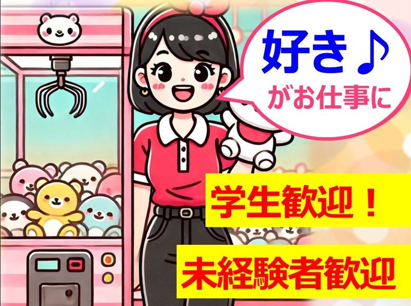 アピールポイント: オープニングスタッフ大募集! 今ならお好きな時間選び放題!! スタートはみな一緒! <おしゃれ自由> 髪型、髪色、ネイル、ピアス自由! <好きをお仕事に> ★ゲームが好き! ★アミューズメントが好き! ★クレーンゲームが好き! ★アニメやキャラクターが好き! ★人と関わるお仕事をしたい方に おすすめです◎