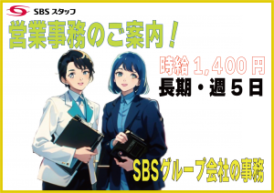 営業事務のご案内★長期・週5日/平日週5日・土日・祝日休み/時給1400円/大阪市★マイカー通勤OK