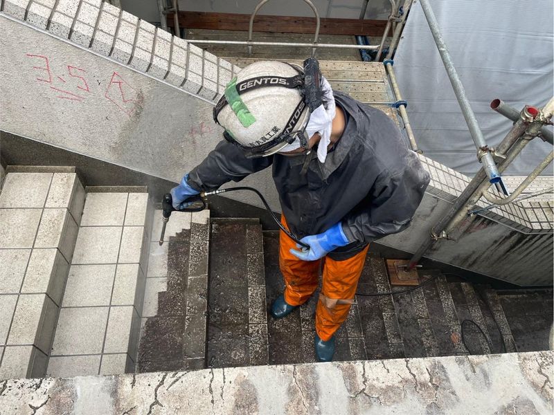 ウォーターガンでの外壁洗浄スタッフ
