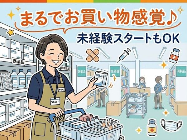 仕事内容 【医療品のピッキング作業】 未経験の方でもすぐに覚えられる、 シンプルでコツコツ進めるお仕事⭐ ■具体的なお仕事の流れ ➀ まずは「出荷指示書(リスト)」の内容を確認 ↓ ➁ 専用カートを引いて、 指定された棚の場所(ロケ)へ向かいます ↓ ➂ リストに記載された医療品を、 必要な分だけ棚から取り出します ↓ ➃ リストの商品がすべて揃ったら、 出荷担当のチームへカートを引き渡し ↓ ➄ 新しい指示書を受け取って、 再び次のピッキングをスタート! ______________ *.★ ここがオススメ ★.*  ̄ ̄ ̄ ̄ ̄ ̄ ̄ ̄ ̄ ̄ ̄ ̄ ̄ ̄ ✅難しい判断は不要! →指示書の内容通りに動くだけなので、 迷うことはありませんよ♪ ✅適度な運動に! →倉庫内を歩きながら作業するので、 リフレッシュしながら働けます ✅未経験大歓迎! →先輩スタッフが丁寧に教えるので、 初めての方も安心です♪ __________________ *.★ 心強い仲間がたくさんいます ★.*  ̄ ̄ ̄ ̄ ̄ ̄ ̄ ̄ ̄ ̄ ̄ ̄ ̄ ̄ ̄ ̄ ̄ ̄ 現在、20代から50代半ばのメンバーが中心になって活躍中! 元々は専業主婦だった方、飲食店や警備のお仕事をしていた方など… ほとんどの先輩が、未経験からのスタートなんです! あなたの「わからない」気持ちを、みんなが理解してくれます。 隣でしっかりサポートするので、何も心配いりませんよ♪