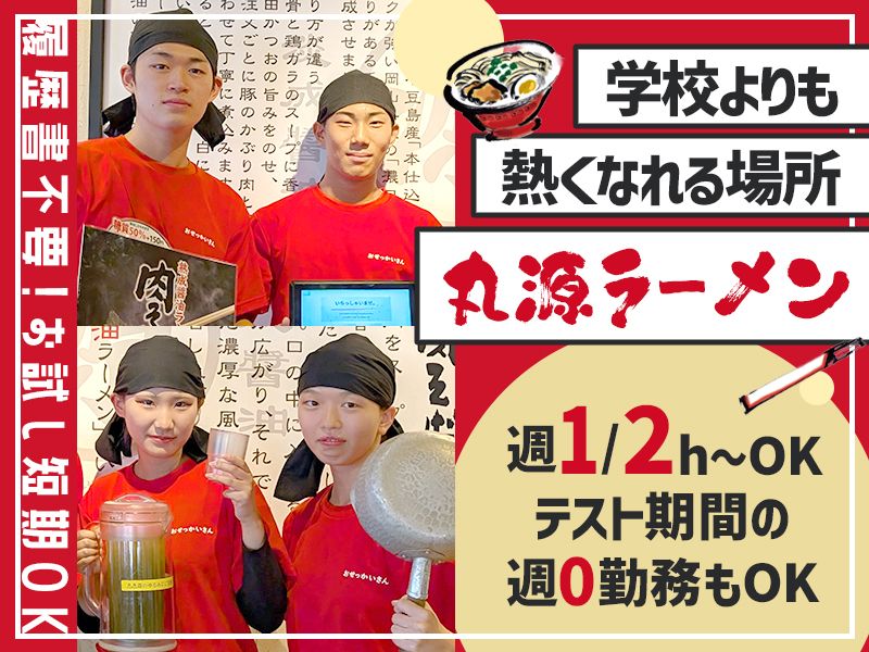 仕事内容 “肉そば”でお馴染みの丸源ラーメンで ホールのお仕事です。 ▽ホール ・お水の補充(ピッチャーづくり) ・お皿/机の片付け ・料理提供 ・レジ など まずは、 「いらっしゃいませ」 「ありがとうございます」 が笑顔で言えれば、OKです◎ 助け合い精神のアットホームで楽しい雰囲気のお店♪ 未経験、バイトデビュー、高校生も大歓迎◎