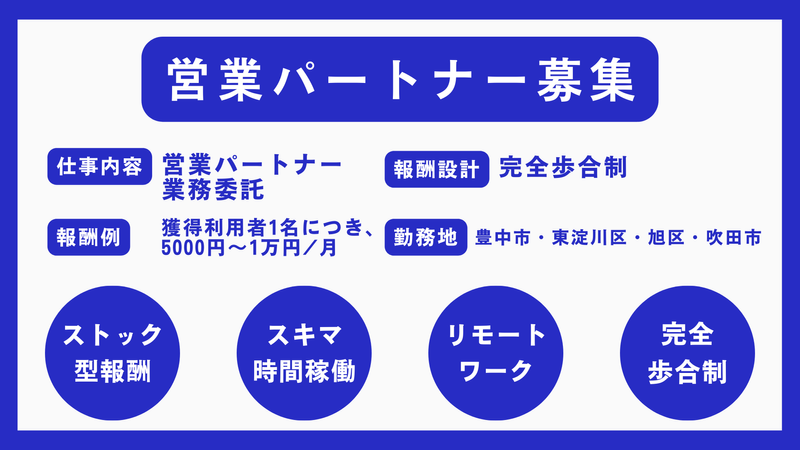 仕事内容 “誰かの暮らしを支える仕組み”を、あなたの仕事に。 訪問介護を必要な人に「ちゃんと届ける」営業、しませんか? 【この仕事の魅力】 れんとは、創業者が「父の介護」という原体験をきっかけに生まれた会社です。 私たちが大切にしているのは、 ただサービスを増やすことではなく、 本当に必要な人に、必要な介護が届くこと。 そのために欠かせないのが、 地域のケアマネジャーさんや関係機関との信頼関係、 そして「この事業所なら安心して紹介できる」と思ってもらえる存在であること。 今回募集する営業職は、 売り込む仕事ではなく、介護を“つなぐ”仕事です。 【れんとで営業をする3つの理由】 ① 数字だけじゃない。「人」を大切にする営業 れんとの営業は、 無理な売り込みやノルマは一切ありません。 「この利用者さんにとって、ここが合うかどうか」 その視点を何より大切にしています。 だからこそ、 短期的な成果よりも、 信頼を積み重ねていく営業ができます。 ② ストック型成果報酬で、積み上がる収入 あなたがつないだ利用者さんが サービスを利用し続ける限り、報酬が毎月発生します。 一度きりの成果ではなく、 長く続く関係性が、そのまま収入になる仕組みです。 副業としても、本業としても、 将来を見据えて取り組める営業スタイルです。 ③ 地域に根ざした「ご当地れんと」を広げる仲間に れんとは将来的に、 全国47都道府県へ展開していく構想を持っています。 この営業ポジションは、 単なる外注スタッフではなく、 地域を支える仲間の一人。 将来的に、拠点運営や独立支援へつながる可能性もあります。 【募集職種】 訪問介護サービスの営業 (業務委託/成果報酬) 【仕事内容】 ・ケアプランセンター・相談支援事業所への訪問・関係構築 ・居宅介護支援事業所等へのサービス案内 ・利用希望者の紹介情報連携 ※契約・請求・現場対応は事業所が行います ※営業方法・訪問先・稼働時間は自由 ※ノルマ・拘束時間はありません 【報酬】 ストック型成果報酬(利用者1名ごと) ・月の介護報酬が 15万円未満:5,000円/月 ・月の介護報酬が 15万円以上:10,000円/月 ※利用が継続する限り、毎月支給 ※複数名紹介の場合は利用者ごとに加算 ※詳細は業務委託契約書に明記します 【こんな方を歓迎します】 ✅ 介護・福祉業界での経験や人脈を活かしたい方 ✅ ケアマネジャーや支援職との関係構築に自信がある方 ✅ 時間に縛られず、自分の裁量で働きたい方 ✅ 人の役に立つ仕事で、長期的な収入を作りたい方 ✅ 将来的に、地域に根ざした事業に関わりたい方 【働き方】 ・完全自由(裁量制) ・直行直帰OK ・副業/Wワーク可 ・営業エリア自由(担当エリア相談可) 【勤務地】 豊中市全域・東淀川区・旭区・吹田市 (主に担当エリア内のケアプランセンター・相談支援事業所・関係機関) 【代表からのメッセージ】 介護は、必要としている人に届いてこそ意味があります。 その「届くまで」を支える存在が、営業です。 数字だけを追う営業ではなく、 人と人をつなぐ役割を、一緒に担ってくれる方と出会いたい。 れんとは、 あなたの経験や想いが、きちんと価値になる場所です。 【最後に】 「今の働き方、この先も続けられるかな」 「もっと意味のある仕事がしたい」 そう感じているなら、 介護を“つなぐ側”として、れんとに関わってみませんか? あなたの一歩が、 誰かの暮らしを支えるきっかけになります。