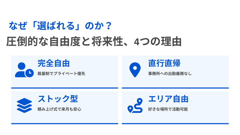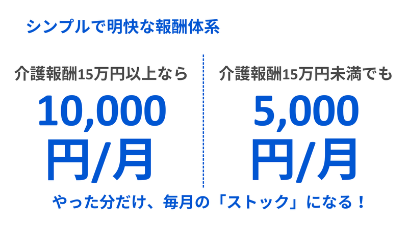完全歩合制 給与詳細 完全歩合制 ストック型成果報酬(利用者1名ごと) ・月の介護報酬が 15万円未満:5,000円/月 ・月の介護報酬が 15万円以上:10,000円/月 ※利用が継続する限り、毎月支給 ※利用者ごとに加算 【給与例】 給与例 【報酬イメージ】 〇月10万円の場合 ・月15万円以上の利用者 × 10名 → 月100,000円が継続支給 〇月20万円の場合 ・月15万円以上の利用者 × 20名 → 月200,000円が継続支給 〇月30万円の場合 ・月15万円以上の利用者 × 30名 → 月300,000円が継続支給 ※すべてストック型報酬のため、 一度つながった利用者が継続利用している限り、毎月支給されます。 副収入としても、本業としても取り組める報酬設計です。