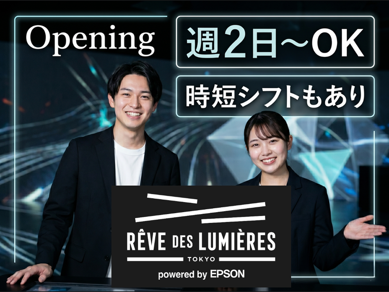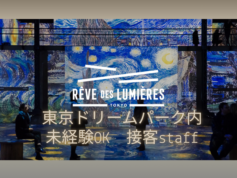 仕事内容 ✨ 日本初上陸!没入型アート施設 ✨ 東京ドリームパーク内 没入型デジタルアート施設 「レーヴ・デ・リュミエール」での ご案内・接客スタッフを大募集! ✅時給1400円 ✅週2日〜&短時間も相談OK ✅接客未経験さんもOK! ✅6月1日からstart! ✅オープニング×大量募集 ══════════ ✨ お仕事内容 ✨ ══════════ ●入場案内・体験中の案内・サポート ●メモリアルグッズ(お土産)の販売補助 ∟レジ打ち、販売物品の在庫管理など ●会場内の清掃 をお任せします! オープニング募集なので たくさんの同期と一斉スタート! 一般公開の前には しっかりとした研修もあるので安心♪ 接客や販売が未経験でも、 笑顔で丁寧な対応ができればOKです! 最新デジタル技術を駆使した 没入型アートを五感で楽しめる 幻想的な施設で、 オープニングスタッフとして 新しいスタートを✨ ═══════════════ ✨ 働きやすい柔軟シフト ✨ ═══════════════ 週2日~勤務OK! Wワークのフリーターさんや 主婦・主夫さん、学生さんも大歓迎! 夕方前までやお昼過ぎからの 時短シフトも相談OK! *・.・*:*・.・*:*・.・*:*・.