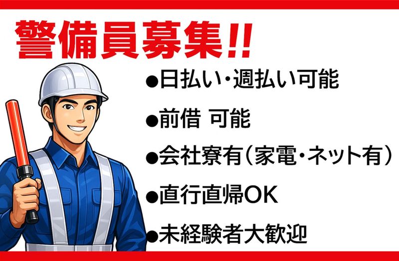 仕事内容 工事現場や建設現場 にて、車両や人の誘導を行うお仕事です。 現場は、1人でできるものや、複数人で連携するものがあります。 【仕事内容】 ✅通行止め ✅片側交互通行 ✅車両の出入り ✅通行者へ案内 ✅夜間の交通規制 <この求人の特徴は...> ✅社員寮完備✨ ・家電付き(エアコン、テレビ、電子レンジ、洗濯機など)なのでカバン一つで即入寮OK! ・インターネット無料(雑誌、漫画の読み放題サービス付き) ・駐車場も無料✨ ✅入社祝い金3〜10万円支給!✨ ・未経験でも確実に受け取れます!経験者や資格保有者は条件優遇! ✅週払い・日払い・前借りもOK! ・急な出費にも安心 ✅資格取得費用は全額会社負担! ・キャリアアップも全力で応援 「ずっとこのままでいいのかな…」 「将来がなんだか不安だ…」 そんな漠然とした気持ちを抱えながら、 この原稿を読んでいる方もいるのではないでしょうか。 ニチケイ株式会社の仕事は、 工事現場や建設現場で、車や人を安全に誘導する、 交通誘導警備員というお仕事です。 「交通誘導」と聞くと、 単純で単調な作業をイメージされるかもしれません。 でも実は、物流倉庫や工場、清掃の仕事で培った 「周囲を見てテキパキ動く力」や、 「コツコツと作業をこなす真面目さ」が活かせる、 とても奥深く、やりがいのある仕事なんです。 現場で、「今、どう誘導すれば、一番スムーズに流れるか?」を常に考え、 テキパキと判断を下していきます。 この仕事の面白さは、 マニュアル通りに動くだけでなく、 現場の状況に応じて工夫を凝らせるところ。 自分の誘導によって、渋滞が解消されたり、 地域の人から「ありがとう!」と声をかけられたり… そんな瞬間に、大きな達成感を感じられます。 「ただの誘導」ではありません。 あなたの働きが、地域の安全を守り、 社会のインフラを支える重要な役割を担っているのです。 アピールポイント: <未経験でも安心!ベテランがマンツーマンで指導> 当社の社員は、20代の若手から70代のベテランまで、 幅広い世代が活躍しています。 アルバイトやパートしか経験がない方、 軽作業や製造業、建設現場からの転職者も大歓迎。 入社後は、警備員として必要な知識や動きを イチから丁寧に教えます。 初めは、優しい現場からスタートするのでご安心ください。 <1日のスケジュールイメージ> 8:00 現場に直行 ↓ 8:10 現場ミーティング、今日の流れを確認 ↓ 8:30 業務開始。一般車両や工事車両を誘導したり、通行人に案内をしたり。 ↓ 10:00 小休憩(10~15分) ↓ 12:00 お昼休憩(しっかり1時間) ↓ 13:00 業務再開 ↓ 15:00 現場によっては、この時間で作業終了。/or小休憩(10~15分) ※この場合でも、日給は全額支給! ↓ 17:00 業務終了。会社には寄らず、そのまま直帰。 お疲れさまでした!!