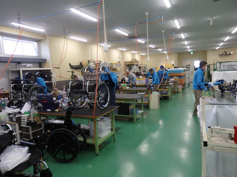 職場環境 冷暖房完備のメンテナンス工場で福祉用具を清掃・整備します。 喫煙所:なし(敷地内全て禁煙)