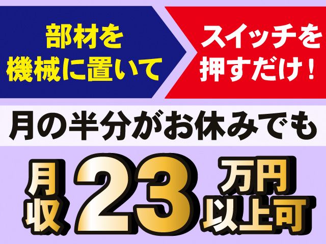 仕事内容 未経験者多数活躍中の機械操作のお仕事! ・年間休日180日 ・月の半分がお休みでも月収23万円以上可 ・フォロー体制充実! 快適環境で長期で働きたい方にオススメです! 庄内&製造のお仕事はマイセルフにお任せ! <お仕事について> 電子部品(米粒)サイズの金属部品の加工機械の操作です。 部品を機械にセットして、ボタンを押すと、 あとは全自動で機械が部品を加工します。 完全に単純作業の繰り返しのため、 どなたでもすぐに覚える事ができます! 重量物は一切ないため体に負担もなし! 先輩スタッフが丁寧に指導致しますので、 製造未経験、経験が浅い方、ブランクがある方もご安心下さい! 基本的な操作手順から、マシンエラーや トラブル時もしっかりとフォロー致します。 <このような方にオススメです> ・20代~40代の男女活躍中 ・シッカリと稼ぎたい方 ・安定してお休みを取りたい方 ・製造の経験を活かしたい方 ・製造業にキャリアチェンジしたい方 ・初めてのお仕事デビューの方 ・将来的に正社員として働きたい方..etc 工場での製造業のお仕事や軽作業、機械加工、 マシンオペレーターの経験をお持ちの方は、 これまでの経験を活かすことができます! 【オススメのポイント!】 ・経験者も未経験者も多数活躍中! ・小型部品の製造業務 ・月の半分がお休み(年間休日180日) ・経験を活かせる高時給ワーク! ・髪色自由、ネイルOKで働けます。 ・綺麗な休憩スペースはありますが、 車でゆっくり休憩を取る事も可能です。 食堂内ではワンコインで食事が出来ます。 <正社員登用制度あり> 頑張り次第で社員登用もあります! 長期でキャリアアップも可能! <週払い&前払い制度あり> お給料日前や入職前も安心! お気軽にご相談ください。 <派遣が初めての方も安心!サポート体制充実!> 面接~入社・入社後迄、同じ担当者が フォロー致します。 お気軽にご相談下さい。