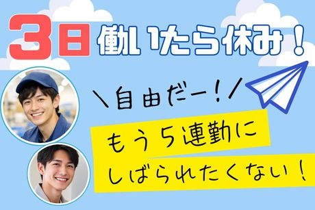 \\初回給与40万円以上可能//★★3月・4月入社の方<10万円>を初回給与にプラス★★もう5連勤にしばられない!3日働いたら休めるってサイコー♪平日の休みって結構使える(≧▽≦)【寮完備/タイパ最強/通勤手当5万円まで支給】