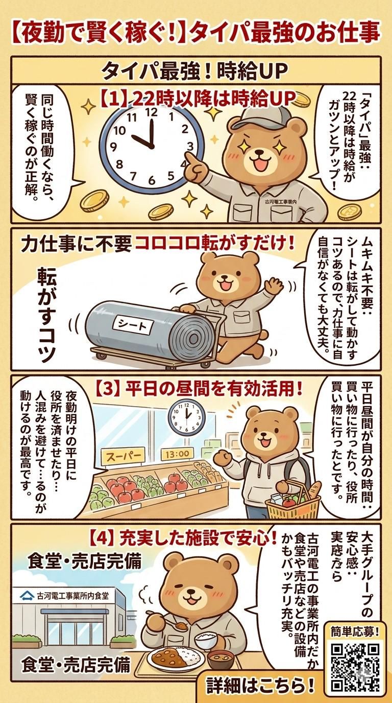 仕事内容 【月収30万超えも!】夜勤で賢く稼ぐ!軽〜いシートの「巻き巻き&チェック」スタッフ募集! 「仕事も大事だけど、プライベートの時間もお金も妥協したくない!」 そんなワガママ、ここで叶えませんか? 扱うのは、ふわふわ・軽いポリエチレンのシート。重いものを持つ苦労はナシ。 深夜の「割増時給」をフル活用して、効率よく稼いじゃいましょう! \ココが推しポイント!/ ●「タイパ」最強: 22時以降は時給がガツンとアップ!同じ時間働くなら、賢く稼ぐのが正解。 ●ムキムキ不要: シートは転がして動かすコツがあるので、力仕事に自信がなくても大丈夫。 ●平日昼間が自分の時間: 夜勤明けの平日に買い物に行ったり、役所を済ませたり…人混みを避けて動けるのが最高です。 ●大手グループの安心感: 古河電工の事業所内だから、食堂や売店などの設備もバッチリ充実。 ◇ お仕事内容はシンプル! 大きなロール状のシート(断熱材などに使われる素材)を作るサポートです。 ・巻き取り: 出来上がったシートを「くるくる」とロール状に巻いていきます。 ・チェック: 汚れやキズがないか、目で見て確認。 ・測定: 厚さがルール通りか測ります。 ・梱包: 最後に袋に詰めれば完了! ・難しい機械操作や、スピードに追われまくる作業ではないので、未経験の方もすぐに馴染めますよ。 ◇ 給与:しっかり稼げる高待遇! ★月20日勤務の場合の月収例 項目計算内容金額基本給1,600円 × 155h=248,000円 深夜割増手当35%割増分 (54h分) 30,240円 残業手当35%割増 (20h分) 43,200円 合計321,440円 ※月によって勤務日数が違いますので、例 293,616円/月18日、例 349,264円/22日 となります。