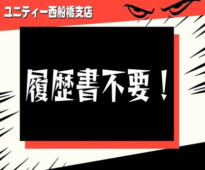 選考プロセス 1)「応募する」ボタンをポチっ! ▼ 2)メールが届いて、面接予約フォームより面接予約の完了♪ ▼ 3)面接にてオシゴトの流れなどを簡単に説明します! ▼ 4)採用となりましたらお仕事をご紹介いたします♪ ※登録会ではないので、必ず採用になるとは限りません。 【問合せ先について】 「〇〇を見ました!」と見た媒体をご伝えください。 【株式会社ユニティー西船橋支店】 応募方法 面接時は履歴書不要です。 気軽に行ける「面接選考会」を随時開催中! 千葉県船橋市葛飾町2-336-1 キュービル2F(会場事務所) ※西船橋駅より徒歩5分