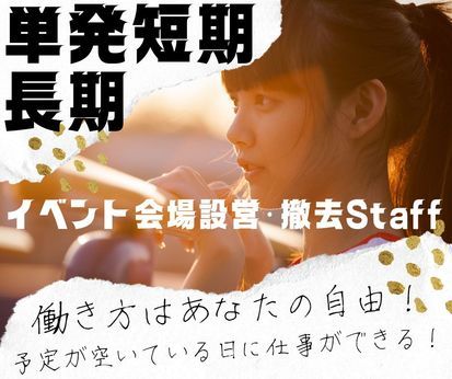 仕事内容 働く日も、働き方も自由! 「空いた日だけ」 「ガッツリ稼ぎたい週だけ」 そんな働き方が叶います 【お仕事ポイント】 作業はチームで行うので 未経験で分からないことだらけでも 安心してお仕事ができます 髪型・髪色・ネイル自由の環境! ※ネイルは作業に支障がないものに限ります※ \イベント会場設営撤去業務/ ○パネルなどでブースの設営 ○テントやステージの設営 ○テーブル、イスなど備品設置 ○スポーツのコートの設営 ○観覧席の設置 ○設営した各種資材の撤去 ○資材の搬入・搬出 【勤務地】 面接は西船橋ですが、働く場所は主に首都圏です。 ☆東京ビッグサイト ☆幕張メッセ ☆パシフィコ横浜 ☆その他大規模会場 ☆都内近郊のイベント会場 ☆都内近郊のスポーツ会場 イベントごとに勤務地は変わります。 ※当社のイベント施工実績※ -屋内イベント- 東京ゲームショー オートサロン トレーディングカードイベント ファッション展示イベント 大型就職説明会 各種試験会場 アーティストのファン交流イベント -屋外イベント- 有名アーティストのライブや音楽フェス 花火大会 お祭り会場 -スポーツイベント- バスケットボール(Bリーグ) バレーボール(Vリーグ) 有名ゴルフ大会 東京マラソン 国体 毎週お給料日になるスタッフも!! お給料は勤務日を締め日として 1週間から10日程度後に銀行口座へ振り込まれるので 毎週お給料をもらっているスタッフが多数います! あなたの生活に合わせて働きましょう! シフトは完全自己申告制です。 こんな方にピッタリ! ○イベントの裏側に興味がある人 ○体を動かすのが好きな人 ○仲間と協力して何かを成し遂げたい人 ◎時間を守れる方 ◎正しくコミュニケーションをとれる方 歓迎条件 ・高卒、専門卒、大卒の方 ・新卒、第二新卒の方 ・業界・職種未経験の方 ・副業、フリーター、ブランクがある方 ・単発・短期バイトを探している方 ・アルバイトが初めての方 ・イベントスタッフに興味がある方 ☆20代が主役!10代・30代も活躍中です☆ <活かせるご経験> 送迎ドライバー、配送ドライバー、 uber、出前館、didi foods等の配達員を やってみようかな...とお考えの方も歓迎! レストラン、居酒屋、スーパー、ホテル、コンビ二などでの接客・販売、 鳶職、現場仕事、軽作業、解体工事、建築作業員、 土木作業員、物流、倉庫内軽作業、食品製造、調理士など 他職種・他業種とのWワークをお考えの方もお待ちしております!! *初めてユニティーでお仕事する方限定 最初に西船橋支店へ面接に来ていただく必要があります。 Webから面接の予約をしてください。 ※登録会ではないので、必ず採用になるとは限りません。