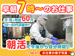 仕事内容 朝7時~の早朝に、スーパーマーケット店内の以下のお仕事をします。 ・お惣菜やお弁当、パンなどの簡単な製造・盛り付け ・商品のパック詰め、ラベル貼り ・売り場への品出し・陳列 ・作業場や売り場の簡単な清掃・整理整頓 ※担当部門は 「惣菜・精肉・鮮魚・ベーカリー」など 適性や希望に合わせて決定します。 ━━━━━━━━━━━━━━━ 先輩スタッフのコメント ━━━━━━━v━━━━━━━ ◆主婦/パート6年目  ̄ ̄ ̄ ̄ ̄ ̄ ̄ ̄ ̄ ̄ ̄ ̄ ̄ ̄ ̄ ̄ ̄ ̄ 朝7時からの勤務なので、家事をひと段落させてから働けています。 製造や品出しは、決まった手順で進める作業が多く、 久しぶりの仕事復帰でも安心でした。 ◆シニア/パート4年目  ̄ ̄ ̄ ̄ ̄ ̄ ̄ ̄ ̄ ̄ ̄ ̄ ̄ ̄ ̄ ̄ ̄ ̄ 早朝の時間帯は店内が落ち着いていて、 自分のペースで作業できるのが良いです。 体力的に不安もありましたが、 無理のない範囲で役割を分けてくれるので、長く続けられています。 健康のためにも、体を動かす習慣として続けています。 ◆フリーター/アルバイト3年目  ̄ ̄ ̄ ̄ ̄ ̄ ̄ ̄ ̄ ̄ ̄ ̄ ̄ ̄ ̄ ̄ ̄ ̄ 昼から別の仕事があるため、早朝シフトを選びました。 製造はレシピやマニュアルが決まっていて、 集中して取り組めるのが合っています。 品出しもあるので、作った商品が売場に並ぶのを見ると やりがいを感じます。 ◆主婦/パート2年目  ̄ ̄ ̄ ̄ ̄ ̄ ̄ ̄ ̄ ̄ ̄ ̄ ̄ ̄ ̄ ̄ ̄ ̄ 朝の短時間で働けるので、その後の予定を立てやすいです。 製造作業は難しそうなイメージがありましたが、 従業員の仲間が丁寧に教えてくれるので、 すぐに慣れることができました。 家庭と両立しながら無理なく働けています。