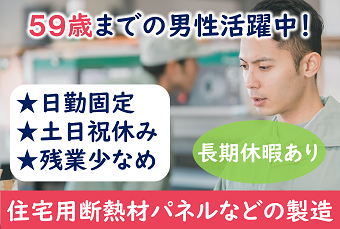 仕事内容 【人気の日勤固定勤務】◎長期就業者多数◎初めてでも自分に合った部署で仕事が出来ます◎日勤固定、原則土日祝休みなので予定も立てやすい! <仕事内容> 【断熱材パネルの製造】 ◎住宅用のパネルであったり、冷蔵トラックのコンテナ用パネルであったり用途は様々です。 【仕事工程】 ●板金:金属を目的のサイズに曲げたり、切断します。 ●組立:目的のパネル形状に金属部品を組み立てます。 ●プレス:プレス機を使用し、組み立てたパネルに特殊な液体を注入します。 ●検査・出荷:外観を整え検査し、良品を出荷します。 立ち作業でのお仕事です。 個人作業となります。 《環境》 男性が多い職場です。 ロッカー有り|休憩室完備 アピールポイント <仕事内容> 【断熱材パネルの製造】 ◎住宅用のパネルであったり、冷蔵トラックのコンテナ用パネルであったり用途は様々です。 【仕事工程】 ●板金:金属を目的のサイズに曲げたり、切断します。 ●組立:目的のパネル形状に金属部品を組み立てます。 ●プレス:プレス機を使用し、組み立てたパネルに特殊な液体を注入します。 ●検査・出荷:外観を整え検査し、良品を出荷します。 立ち作業でのお仕事です。 個人作業となります。 《環境》 男性が多い職場です。 ロッカー有り|休憩室完備 \充実した福利厚生/ ◎社会保険・雇用保険完備 ◎有給休暇有(6ヶ月経過後、10日付与)※規定あり ◎残業手当 ◎交通費支給(規定内) ◎確定拠出年金制度 ◎週払い制度(週3回対応・規定あり) ◎お友達推薦制度あり(規定あり) ※1名につき3万円~10万円臨時給与として支給 ◎職場見学あり ◎車(マイカー)・バイク通勤可(無料駐車場あり) ◎作業着貸与 ◎食事持参可 ◎仕出し弁当注文可 ◎ロッカー・休憩室利用可 ◎福利厚生プログラム (宿泊、グルメ、ショッピングなど大幅割引が受けられる10万アイテムのメニューがあります。)